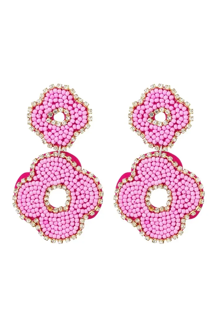Earrings beads double flower Fuchsia