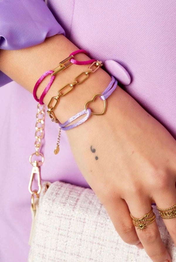 Roze stoffen armband met gouden bedel.